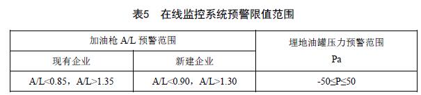 6.3.4 在24 h(自然日)內,在線監(jiān)控系統(tǒng)應監(jiān)測和保存每次加油的A/L,當每條加油槍有效A/L(每次連續(xù)加油量大于15 L)處于表5規(guī)定范圍的次數(shù)達到總次數(shù)的25%,在線監(jiān)控系統(tǒng)應預警,連續(xù)5 d出現(xiàn)預警狀態(tài)應報警,若當日某加油槍加油次數(shù)小于5次時,在線監(jiān)控系統(tǒng)不對該加油槍進行A/L預警和報警判斷,并與次日加油次數(shù)進行累計,直至大于等于5次后再進行A/L預警和報警判斷;在線監(jiān)控系統(tǒng)應自動關閉A/L報警的加油槍.