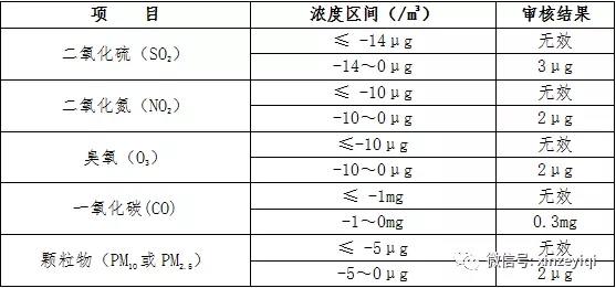 (6)因儀器設備故障、運行不穩(wěn)定或其他監(jiān)測質量不受控原因出現(xiàn)的負值和零值,均按無效數(shù)據(jù)處理。在空氣中各項污染物濃度均處于極低水平的情況下,部分儀器設備小時監(jiān)測結果出現(xiàn)負值或零值時,需人工判別:在確認非儀器故障的前提下,當監(jiān)測值超過可控范圍時,按無效處理;當監(jiān)測值在可控范圍時,應按規(guī)定進行修約。處理方式詳見附件中表1。