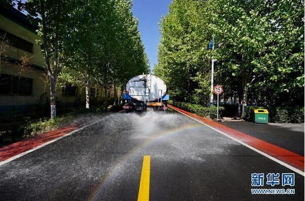 4月23日,灑水車在位于河北省沙河市的河北鑫利玻璃有限公司廠區(qū)內(nèi)灑水防塵。 2019年起,有“中國玻璃城”美譽的河北沙河市啟動了“煙羽消白”工程,先后投入20億元對在產(chǎn)玻璃生產(chǎn)線實施超低排放改造,并結(jié)合提升廠區(qū)環(huán)境、優(yōu)化產(chǎn)能等措施,削減粉塵、二氧化硫、氮氧化物等污染物排放,推進大氣污染治理。新華社記者 牟宇 攝