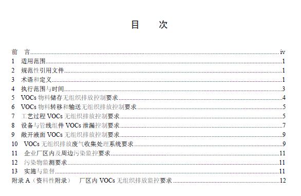為貫徹《中華人民共和國環(huán)境保護法》《中華人民共和國大氣污染防治法》,防治環(huán)境污染,改善環(huán)境質(zhì)量,加強對 VOCs 無組織排放的控制和管理,制定本標準。本標準規(guī)定了 VOCs 物料儲存無組織排放控制要求、VOCs 物料轉(zhuǎn)移和輸送無組織排放控制要求、工藝過程 VOCs 無組織排放控制要求、設(shè)備與管線組件 VOCs 泄漏控制要求、敞開液面 VOCs 無組織排放控制要求,以及 VOCs 無組織排放廢氣收集處理系統(tǒng)要求、企業(yè)廠區(qū)內(nèi)及周邊污染監(jiān)控要求。本標準為首次發(fā)布。