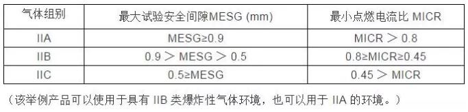 爆炸性氣體混合物的傳爆能力,標(biāo)志著其爆炸危險(xiǎn)程度的高低,爆炸性混合物的傳爆能力越大,其危險(xiǎn)性越高。爆炸性混合物的傳爆能力可用最大試驗(yàn)安全間隙表示。同時(shí),爆炸性氣體、液體蒸汽、薄霧被點(diǎn)燃的難易程度也標(biāo)志著其爆炸危險(xiǎn)程度的高低,它用最小點(diǎn)燃電流比表示。II類隔爆型電氣設(shè)備或本質(zhì)安全型電氣設(shè)備,按其適用于爆炸性氣體混合物的最大試驗(yàn)安全間隙或最小點(diǎn)燃電流比,進(jìn)一步分為IIA、IIB和IIC類。如下表所示。