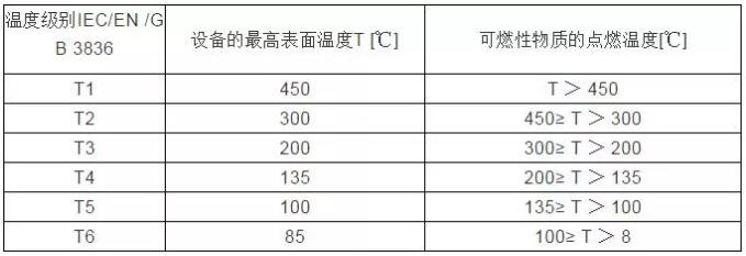 電氣設(shè)備按其最高表面溫度分為T1~T6組,使得對(duì)應(yīng)的T1~T6組的電氣設(shè)備的最高表面溫度不能超過對(duì)應(yīng)的溫度組別的允許值。溫度組別、設(shè)備表面溫度和可燃性氣體或蒸汽的引燃溫度之間的關(guān)系如下表所示: