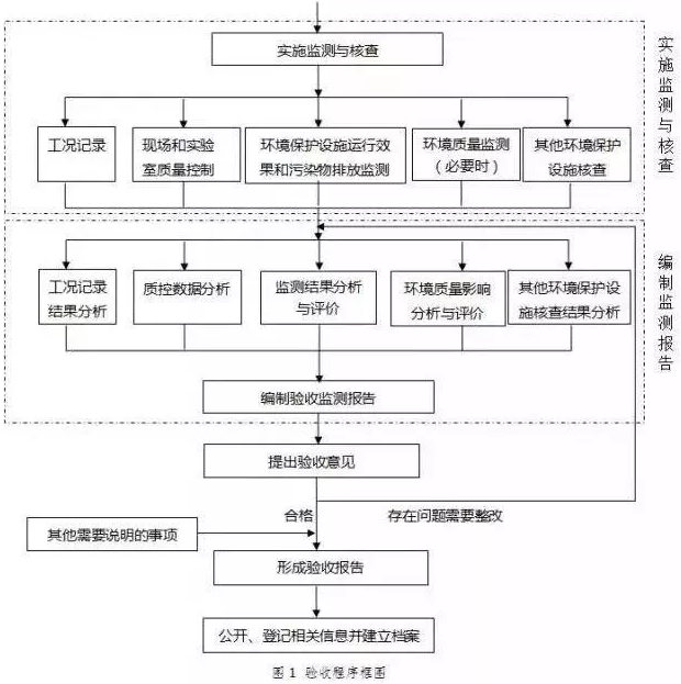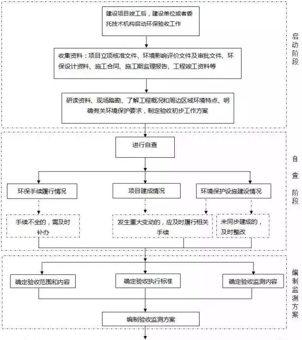 驗收監測工作可分為啟動、自查、編制監測方案、實施監測和核查、編制監測報告五個階段,具體工作程序見下圖: