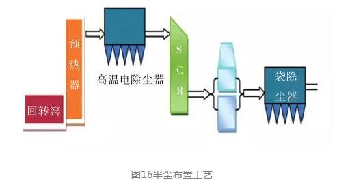 圖16為水泥廠SCR脫硝的半塵布置或中塵(MiddleDust)布置工藝,它需要在SCR反應器之前安裝高溫電除塵器。因為高溫電除塵器的除塵效率不能達到很高,所以出口含塵量仍然較高,特別是除塵器電場事故致使廢氣含塵量高不可避免,半塵布置方案也與高塵方案存在同樣問題。另外,通過高溫電除塵器的氣體溫度還會有所降低,也不利于常規催化劑高效運行。國內外實際應用的報導都同樣是不能穩定運行。