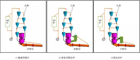 分解爐的型式有多種,以旋流噴騰爐、旁置預(yù)燃室爐和流化床爐三種爐型為研究對(duì)象,A和D生產(chǎn)線分別為典型的旁置預(yù)燃室爐和流化床爐型,重點(diǎn)對(duì)預(yù)燃室出口和流化床爐出口的煙氣成分進(jìn)行了測(cè)試,結(jié)果見表4。三種不同型式分解爐如圖2所示。